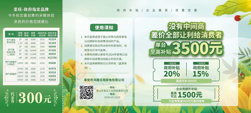 如今,泰安市举行家电以旧换新补贴政策,我公司三类产品成功入围,包括空气源热泵热风机、冷水机组和燃气壁挂炉。消费者购买我公司一级能耗产品可享受政府 20%的补贴,二级能耗产品可享受 15%的补贴。在此基础上,我们面向全市消费者再额外发放 300 万的代金券,单张面值 300 元,共 1 万张。这意味着在政府补贴的同时,消费者还能享受我公司让利 300 至最高 1500 元的优惠,真正实现政企双补,福利翻倍。
